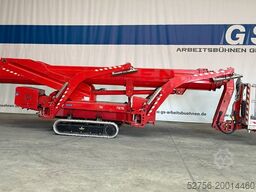 Bijzonderheden: Rijaandrijving, witte rubberen rupsen, draaibare werkbak, korfarm, draaibereik +/-90°, hoge korflast 400 kg.